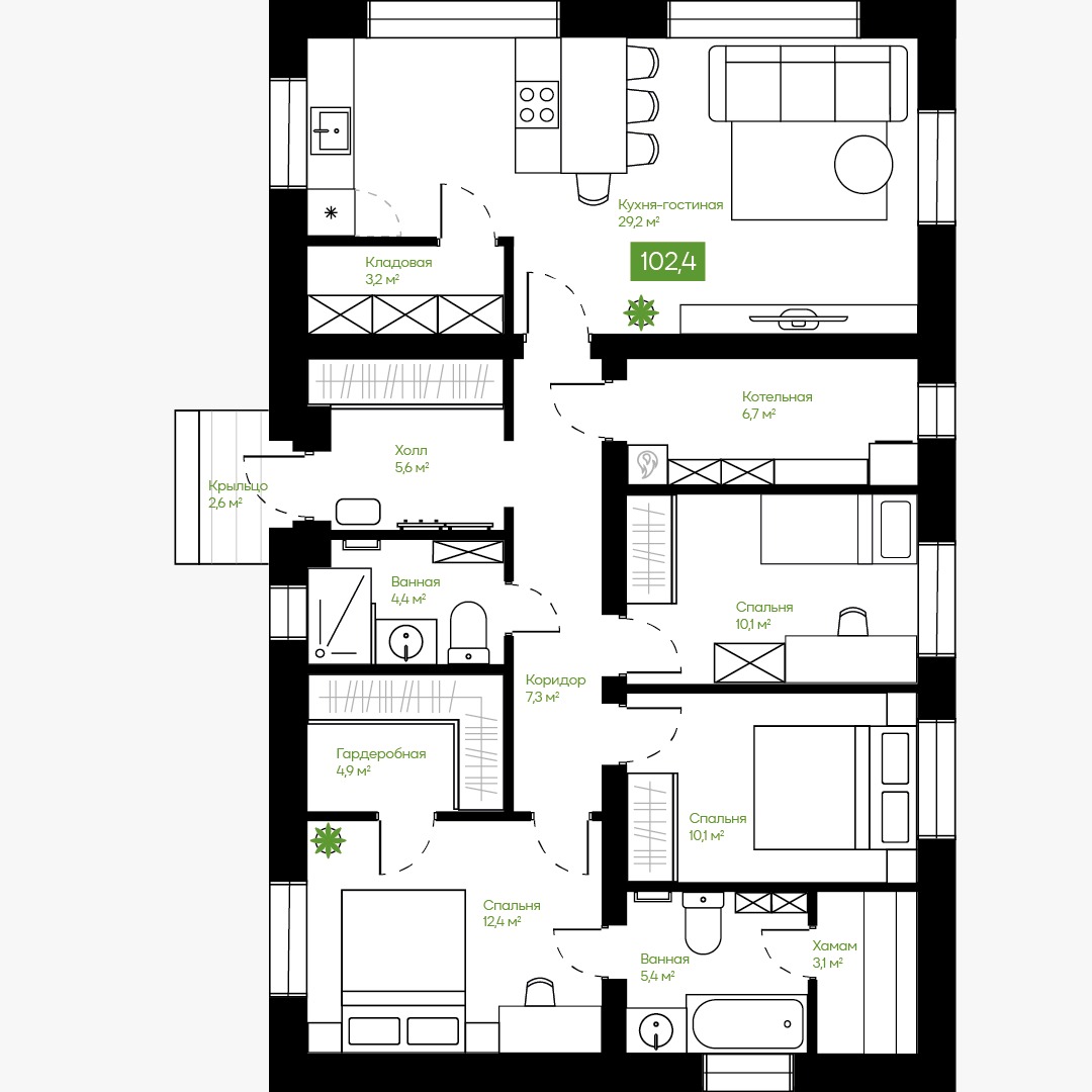 • Горизонтальная разводка холодной и горячей воды к мокрым точкам на кухне и в санузлах