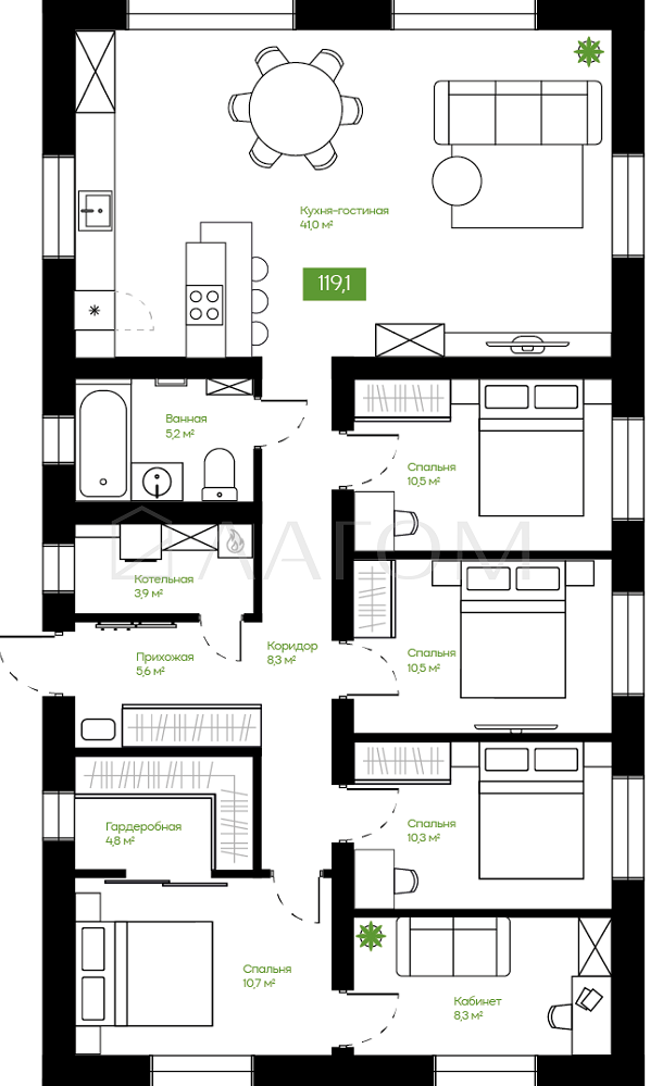 • Горизонтальная разводка холодной и горячей воды к мокрым точкам на кухне и в санузлах