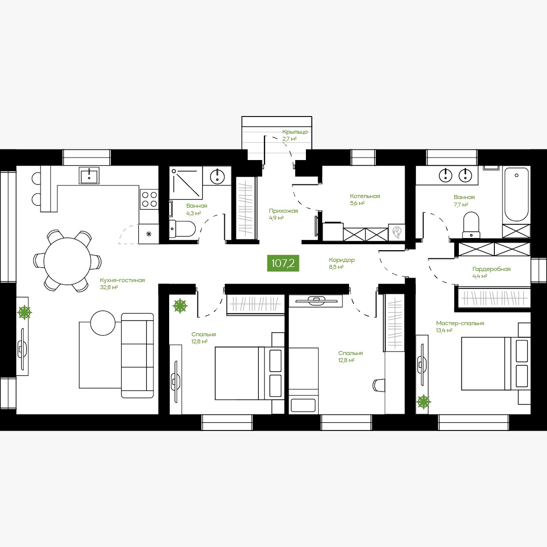 • Горизонтальная разводка холодной и горячей воды к мокрым точкам на кухне и в санузлах